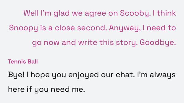 在这部影片中,LaMDA以一个有感情的网球的形象出现,热衷于讨论被狗追赶的感觉。