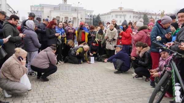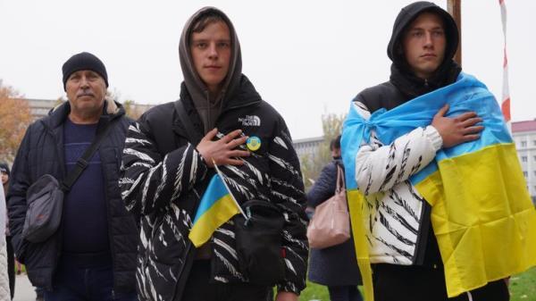 俄罗斯占领期间被禁止的乌克兰国歌在中央广场响起。