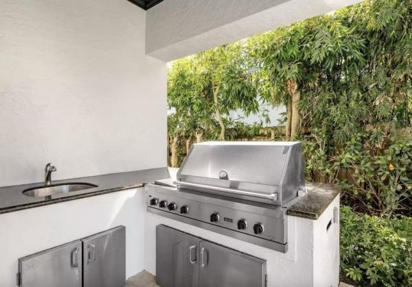 后立面的两侧设有通风的有顶门廊,有大量的户外用餐和娱乐空间。这栋房子有一个可停放三辆车的车库,凉亭下面有一个燃气供电的户外厨房,屋前还有雕刻的灌木和其他植物。