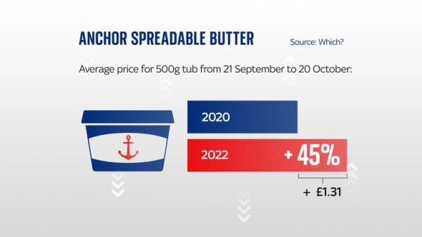 最大的飞跃之一发生在品牌黄油上。两年间,六家超市的500克锚牌黄油桶平均上涨了1.31英镑(45%)。