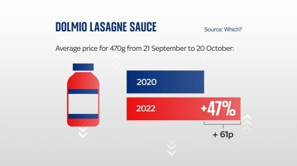 《Which?》杂志收录的品牌产品的平均涨幅排名第二。多米奥千层面酱(470克)两年内在六大超市上涨了47%或61便士。