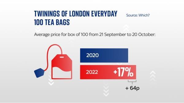 在一家超市,川宁每日100袋茶包的绝对价格涨幅最大——与2020年的基础价格相比,2022年上涨了2.33英镑(64%)。六家零售商的茶包平均上涨了64便士(17%)。