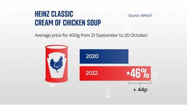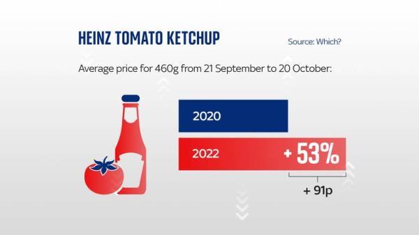 在他们的购物清单中,亨氏番茄酱——自上而下挤压的那种(460克)——整体平均涨幅最大,在六家零售商中上涨了53%(91便士)。