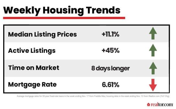 事实上,在截至11月12日的一周内,总体库存(包括新上市的房屋和仍滞留在市场上未售出的陈旧房屋)较上年同期增加了45%。此外,房屋在市场上停留的时间比去年同期多了8天。