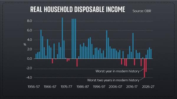 但独立的预算责任办公室警告称,英国家庭的可支配收入将在未来两年下降7.1%,这是自1956/7年度有记录以来的最低水平,并将下降到2013年的水平。