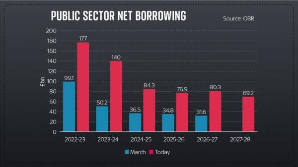 然而,后退一步,看看五年后的公共财政状况。今年3月,英国政府计划到2026/27年度将公共部门净借款降至316亿英镑。根据秋季报告,英国政府计划将预算削减至803亿英镑。