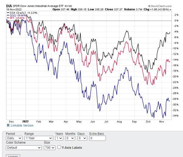 道琼斯工业指数(DIA)无疑是2022年迄今为止三大指数中表现最好的。今年以来,DIA下跌了近4%,而标准普尔500指数(SPY)下跌了14%以上,纳斯达克100指数(QQQ)今年以来下跌了近29%。考虑到DIA相对于SPY或QQQ更高的股息率,整体表现差距会进一步扩大。