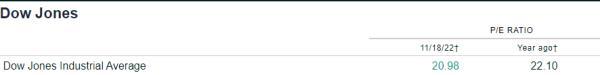 从市盈率估值的角度来看,道琼斯指数已经有所下降。目前市盈率略低于21倍,而一年前略高于22倍,跌幅约5%。