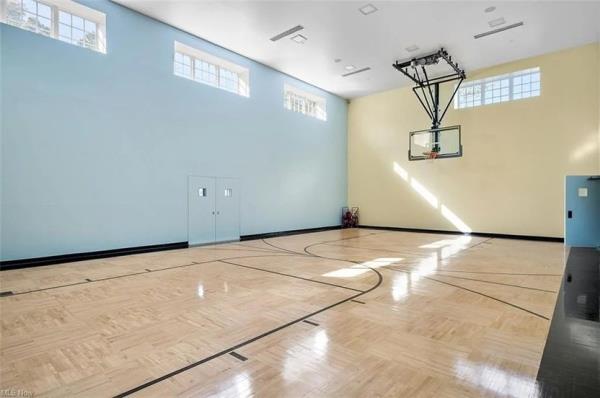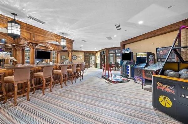这座豪宅的下层是为下一层的乐趣而设计的。它包括一个家庭影院,一个带舞台和卡拉ok系统的夜总会(是的,真的!),一个酒窖,一个健身房,一个两层楼高的攀岩墙,一个带洞穴的室内游泳池和一个室内运动场。