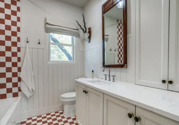 沃尔夫之所以选择在浴室的瓷砖上使用棋盘格趋势,可能是因为它易于安装,而且与其他设计细节很好地结合。