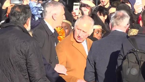 当你回头看视频时,你会看到他们巧妙地将国王移开,一名20多岁的男子因为据称试图扔鸡蛋而被捕。