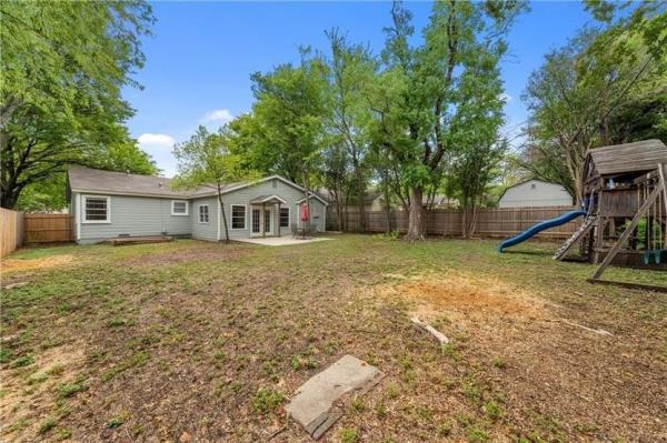在宽敞的后院,盖恩斯夫妇有8538平方英尺的土地,他们把杂乱的灌木和树木移走,创造了一个漂亮的天井——一个野餐桌或带火坑的休息区的完美地方。