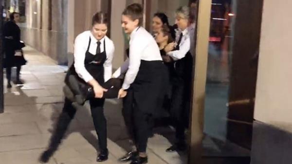 抗议组织分享的视频显示,一名女子被餐厅工作人员抬到街上,然后坐在路边。