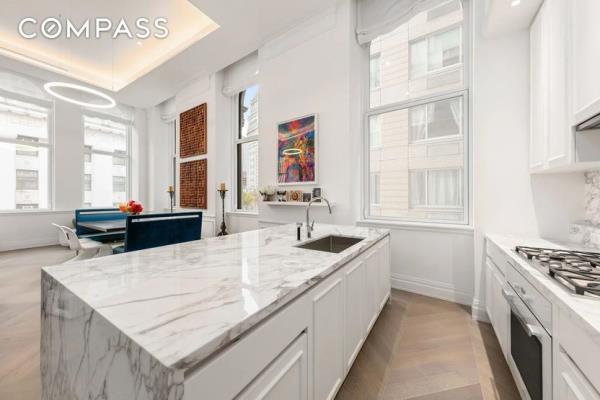 这套公寓拥有高耸的天花板和优雅的设计,面积为2448平方英尺(约合448平方米)。橡木地板和意大利大理石提供高端光泽,厨房里的Miele电器和瀑布岛也是如此。