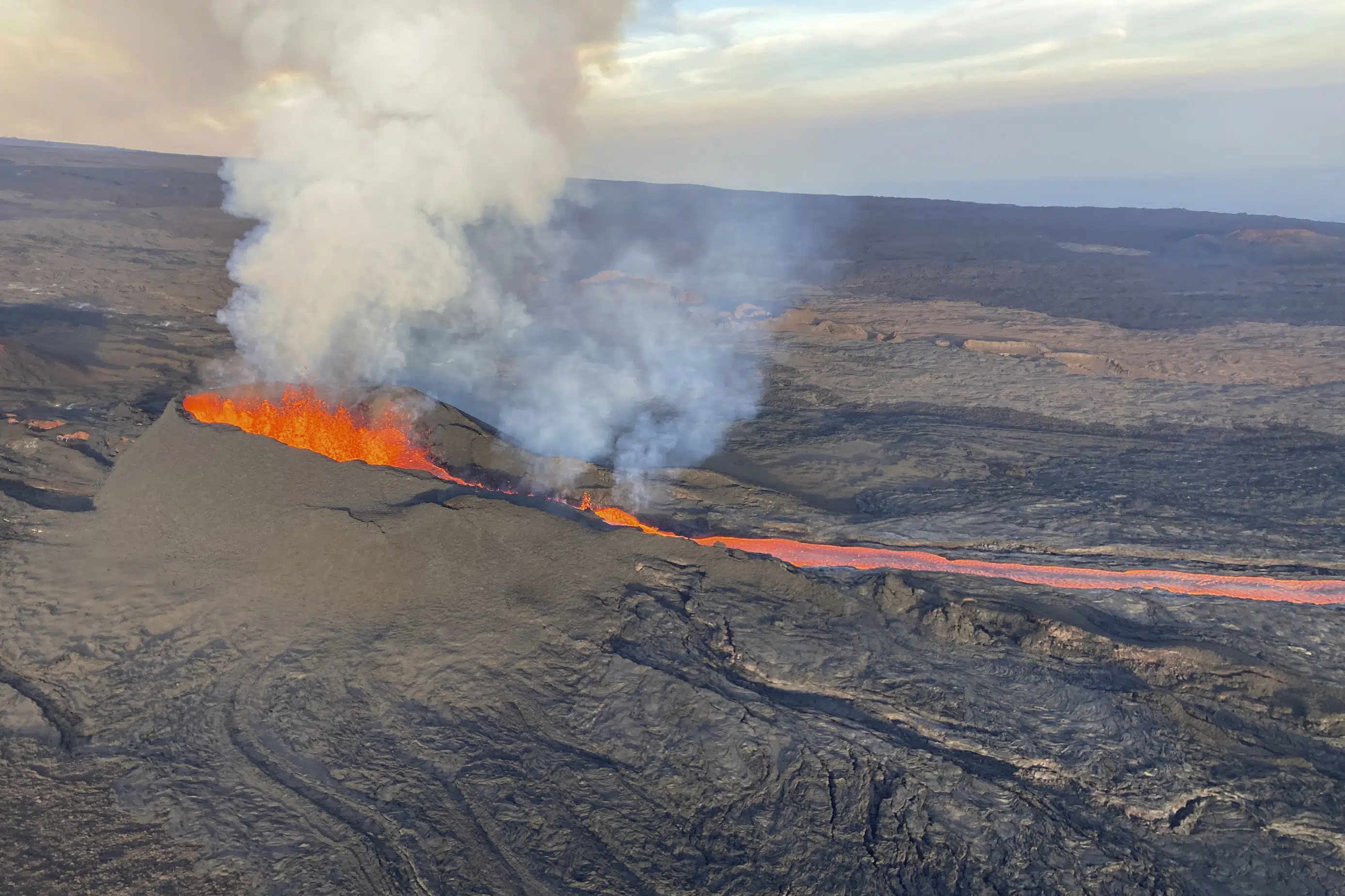 洪说,莫纳罗亚火山的喷发似乎正在减弱,附近的基拉韦厄火山现在已经“完全停止”,熔岩湖停滞不前,结了壳。