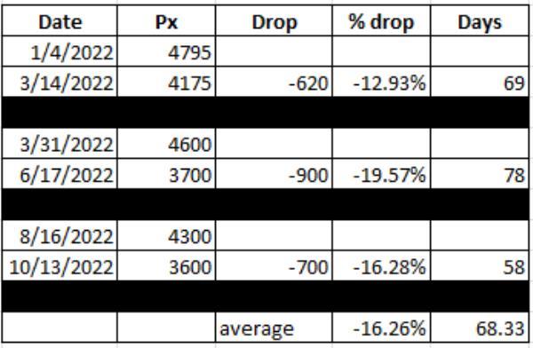 今年迄今为止,三次下跌的平均跌幅略高于16%,时间大约两个多月。这将相当于标准普尔500指数在2023年2月17日2月期权到期前跌至3400美元左右——如果平均水平保持不变的话。
