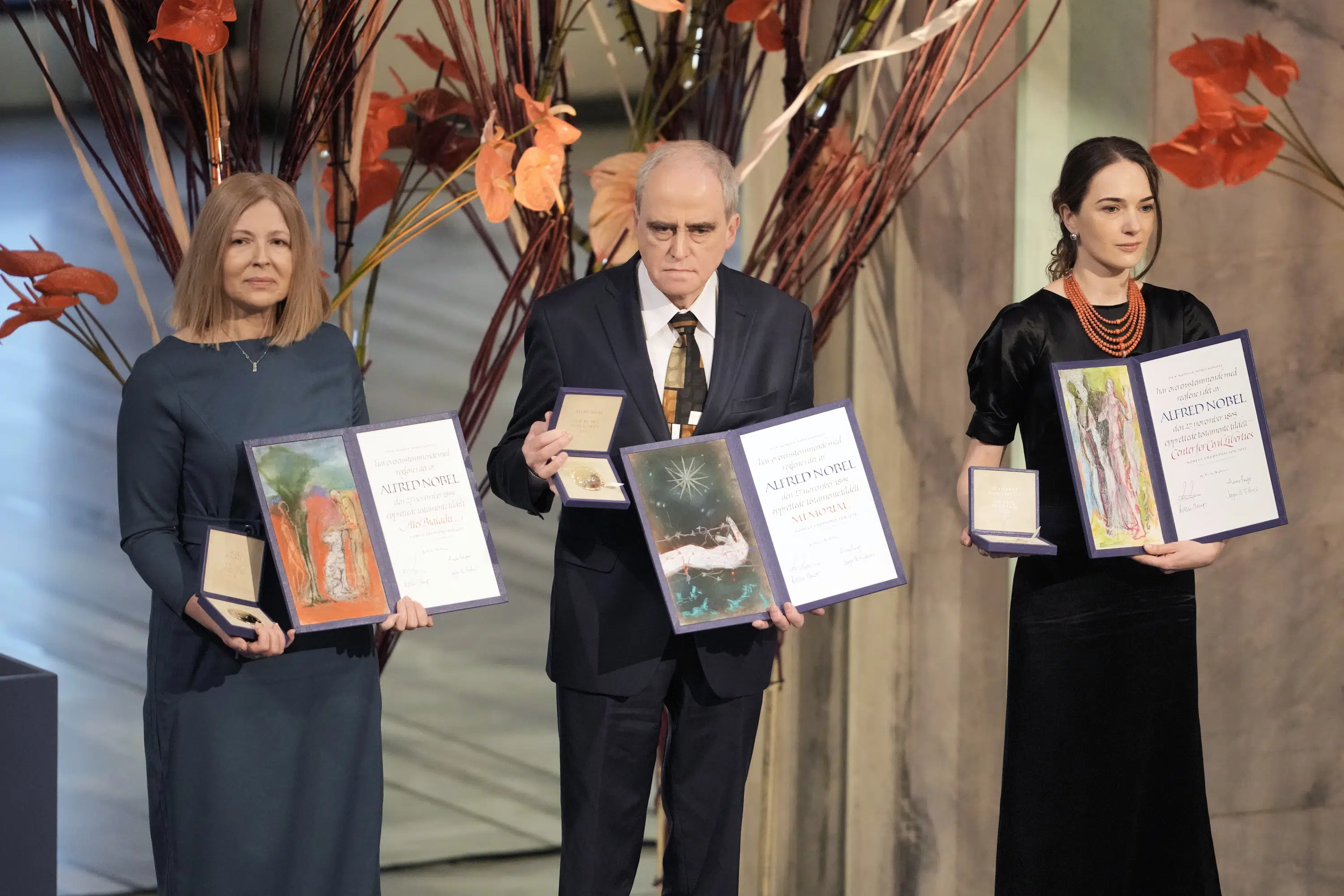 奥斯陆,挪威(美联社)——在周六的颁奖仪式上,来自白俄罗斯、俄罗斯和乌克兰的今年诺贝尔和平奖得主分享了他们对更公平世界的愿景,并谴责了俄罗斯总统弗拉基米尔·普京在乌克兰的战争。