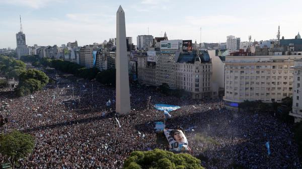 阿根廷队在世界杯决赛中获胜,成千上万的球迷欣喜若狂地涌上布宜诺斯艾利斯的街头。