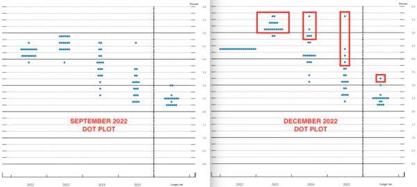 美联储的“点阵图”基本上是一个可视化工具,它显示了每位美联储官员对短期、中期和长期利率的预期。这是9月份的点阵图(左),旁边是昨天会议的点阵图(右)。