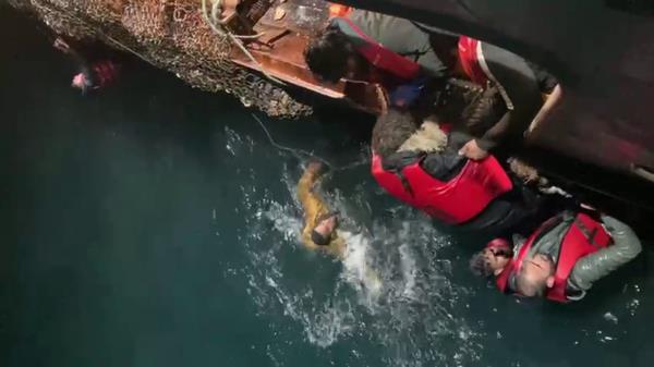 在天空新闻分享的视频中,可以看到捕鱼人员把惊慌失措的人们拖到船的一侧。