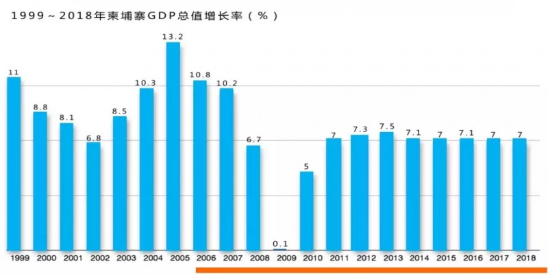 2010-2017年,柬埔寨平均GDP增长率达7%以上。根据柬埔寨央行资料显示,2018年该国经济增长率为7.3%,超过世界银行与IMF预估。而IMF预测其2019年GDP增长率将达7%。在全球经济情势紧张、各大国际机构下调各国经济表现预测之际,柬埔寨依旧强劲成长,被众多投资人一致看好。
