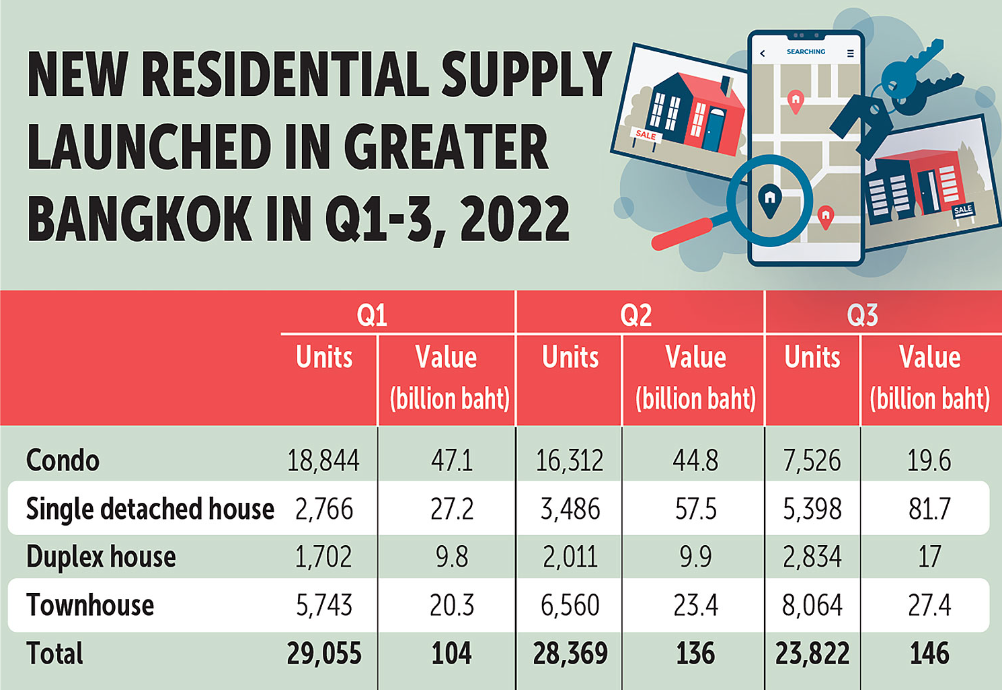 由于通货膨胀和利率上升影响了开发成本,大曼谷地区第三季度新推出的共管公寓供应量较第一季度和第二季度连续下降。