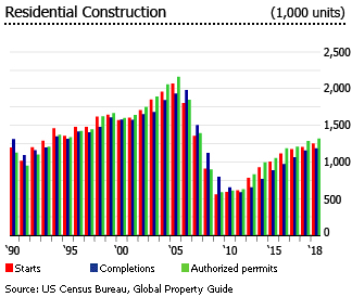 从1990年到2007年,房屋竣工量平均每年为150万套,在2006年达到近200万套的峰值,但在2011年跌至584,900套。住宅建筑在2012年开始恢复,到2018年又回到1,184,900套。但是,这仍远低于2005/6的峰值。