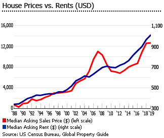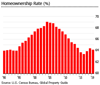经过三年的增长,由于房地产价格持续上涨和严格的信贷标准,房屋所有权在2019年上半年再次下降。根据美国人口普查局的数据,2019年第二季度美国的房屋拥有量为64.1%,低于2018年的64.4%,低于2004年的峰值69%。