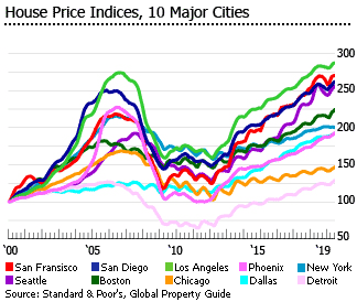 | 美国城市 | 住房热潮(1996年1月至2006年3月) | 房屋崩盘,全球危机(2006年4月至2011年12月) | 住房复苏,繁荣(2012年1月至2018年12月) | 2019年第二季度(同比变化) |