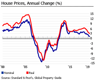 同样,联邦住房金融局(Federal Housing Finance Agency)的经季节性调整的仅购买美国房屋价格指数在2019年第二季度同比增长4.76%(经通胀调整后为3.12%),是近五年来的最低增幅。FHFA指数在最近一个季度仅比上一季度增长0.75%(经通胀调整后为-0.02%),是自2011年第四季度以来的最低水平。