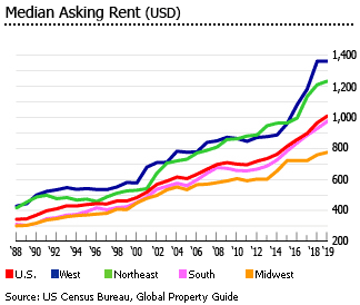 在东北,2019年第二季度的平均租金要价比去年同期增长了14.9%,达到每月1303美元。在中西部,2019年第二季度的租金中位数同比增长3.5%至每月797美元。在南部,2019年第二季度的租金中位数同比增长1.8%至每月945美元。在西方,2019年第二季度的租金中位数与去年同期持平,为每月1,358美元。