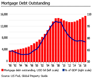 根据《全球房地产指南》的估计,抵押贷款市场的规模在2018年相当于GDP的75%以上,低于过去五年的77%以上,远低于2009年的GDP的100.1%。