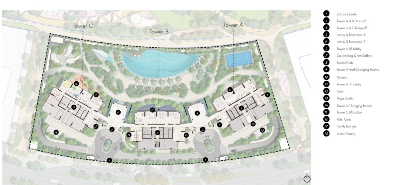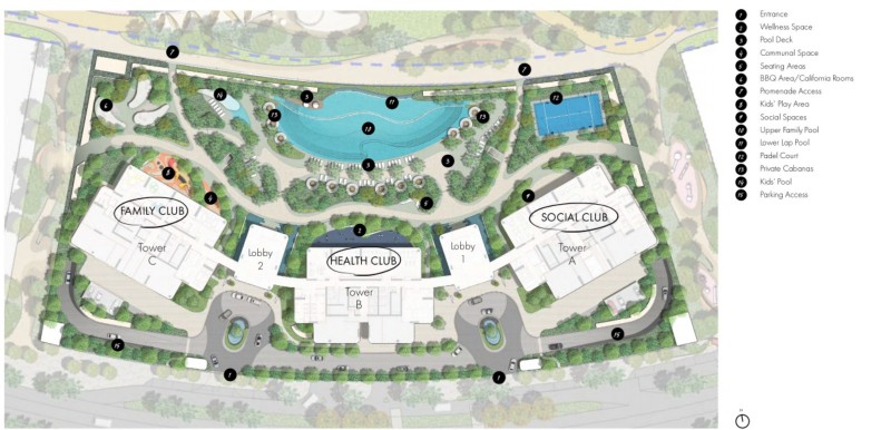 共享办公及艺术画廊社交俱乐部A塔泳池更衣室电影院健身房瑜伽室B塔更衣室儿童俱乐部家庭休息室访客停车场
