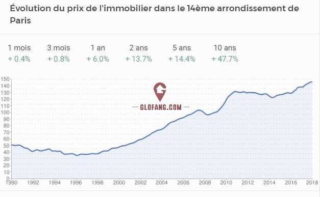 巴黎14区房价最近20年曲线图,从2002年6000 欧元每平方米,2008年10000 欧元每平方米,到2018年14000 欧元每平方米,20年涨幅350%,法国的物价稳定,经济增长缓慢,通货膨胀率从2004年到2018年每年在 0.1% - 2.8 % 之间徘徊 ,350 % 的房价涨幅是 惊人的。 而巴黎高昂的房价,并没有让投资者却步,根据安永的数据显示,2018年巴黎首次取代伦敦,成为最具有吸引力的欧洲城市。在巴黎出租房永远是供不应求,再加上英国脱欧后欧洲金融中心将逐渐从伦敦迁到巴黎,2019年巴黎地产将迎来新一轮增长。