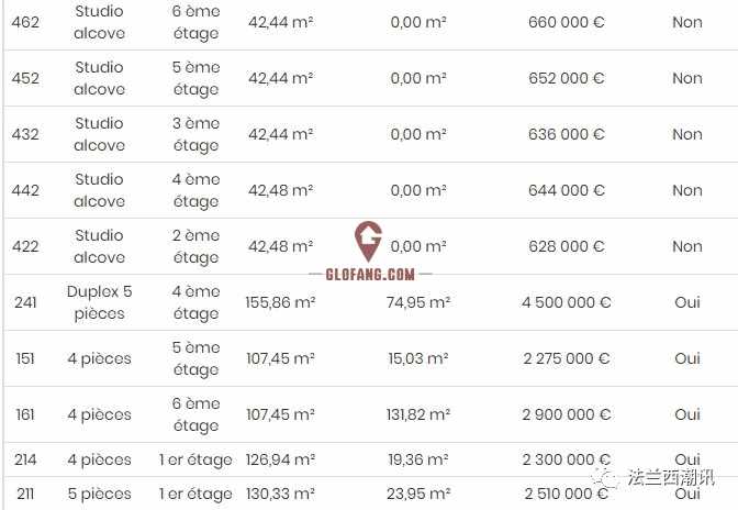 套内实际使用面积 42.44 平方米到130.33 平方米, 价格 66 万到 251 万欧元。