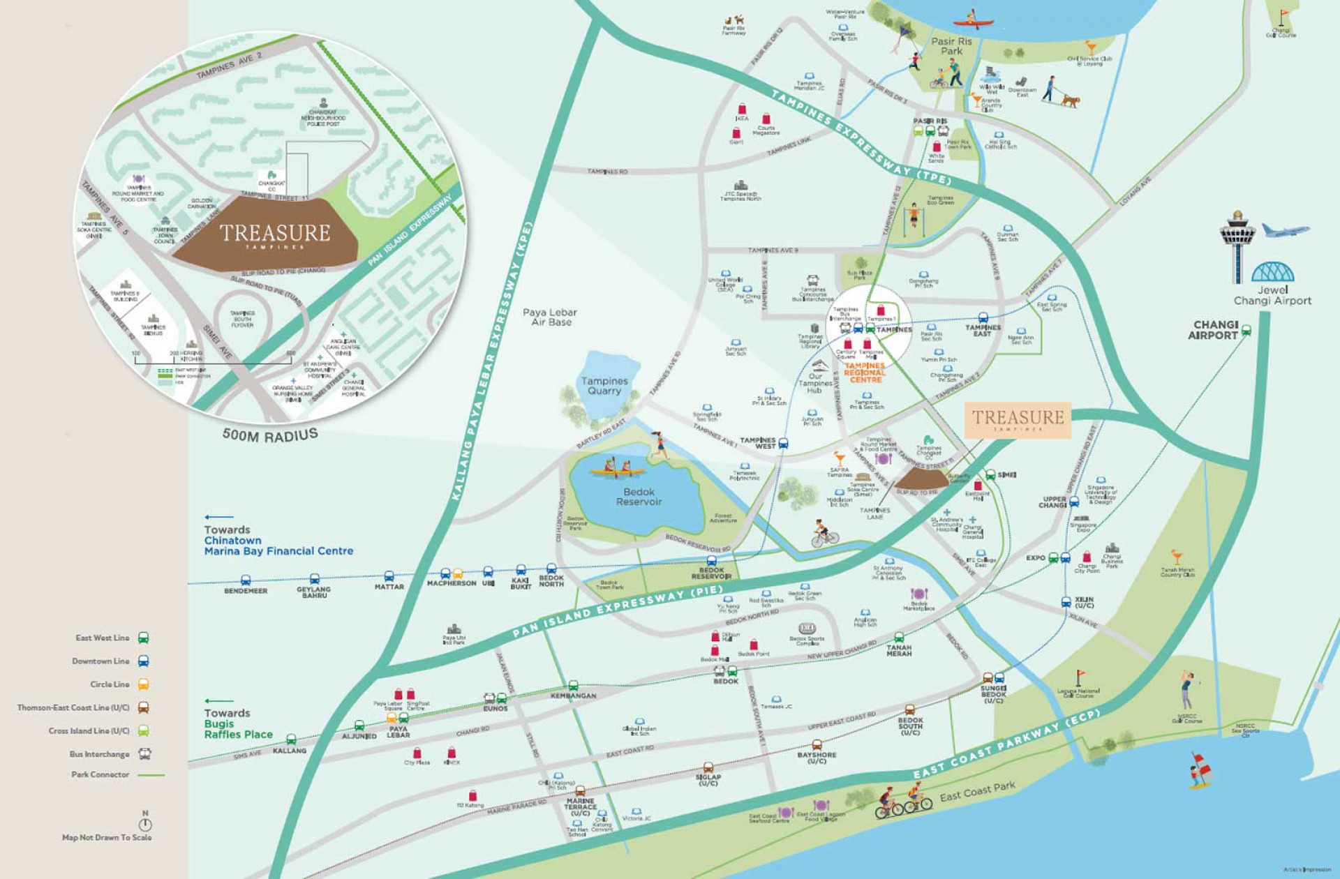 Treasure At Tampines (聚宝园)总占地面积约60,283㎡,容积率为2.8,由29栋12层高楼组成,共有2,203个住宅单位,户型多样,建筑面积介于43㎡——159㎡。