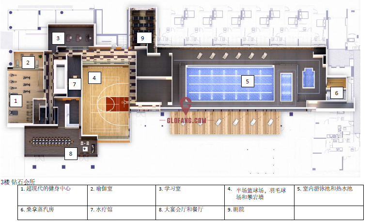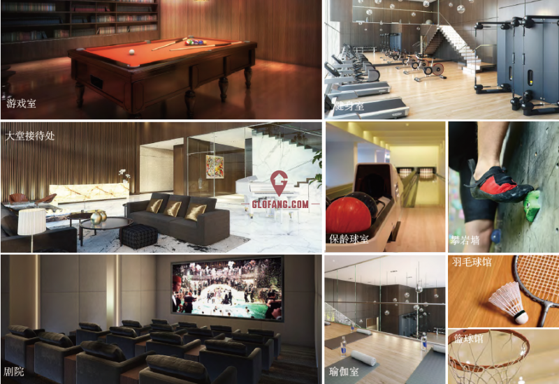 配套设施:钻石会所、篮球场、羽毛球场、攀岩墙、高尔夫球模拟器、娱乐游戏室、健身中心、瑜伽室、学习室、室内游泳池和热水池、桑拿蒸汽房、水疗馆、大宴会厅和餐厅、剧院