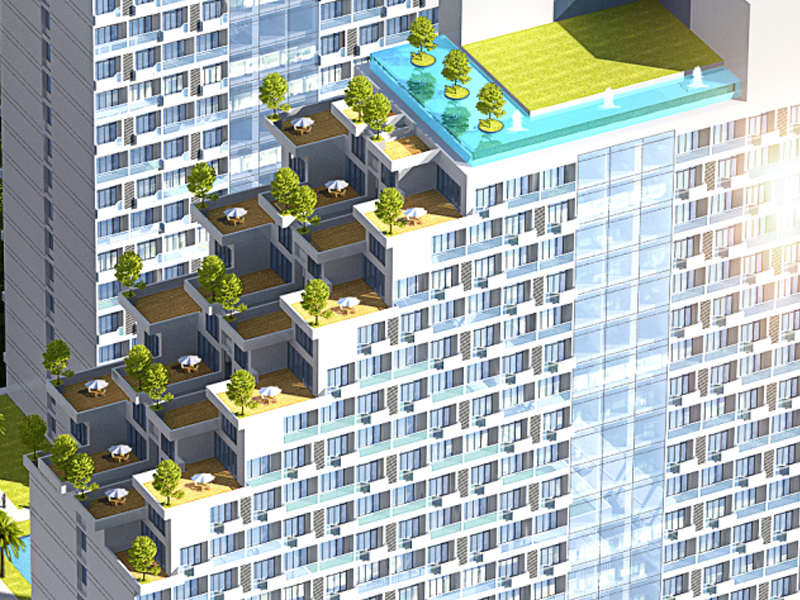 从20层开始到27层,每一层退台3.5米,形成“梯田情景式”层层退台,层层递进,构成一个错落有致的空间,并使高层空间都能享有公共的空中花园,为西港打造最美天际线,为广大投资者和业主奉献端的居住体验。
