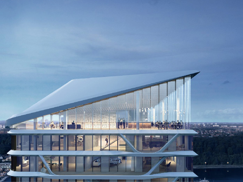 港城壹号以中国汉语文字“人”为原形设 计,同时也像大写字母“A”字斜撑起大楼主体,形成人造景观,此造型设计新颖独特,必将成为西港最具特色的景观地标,致力打造西港网红地标