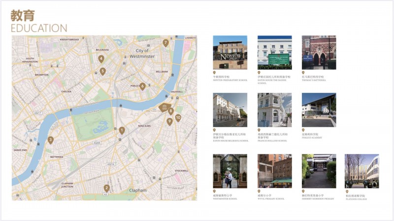 泰晤士河 1 号项目附近有多所国际知名中小学校及名校世界云集,5 公里范围内有 10家顶尖优质私立学校,其中包括: