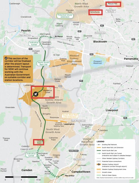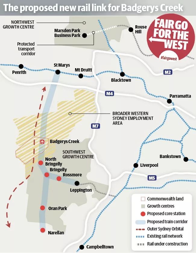 西南铁路线从Leppington延伸至Badgerys Creek机场,新州政府斥资超过20亿澳元,建设南北铁路线,从St Marys延伸至Badgerys Creek机场,与现有的悉尼火车T1西部线交汇。
