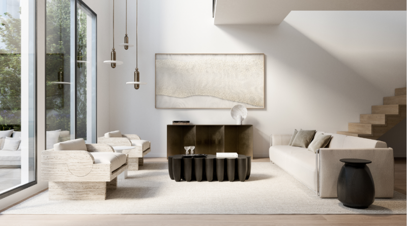 客厅舒适柔软的沙发与石质框架的单人沙发椅相对摆放,形成一软一硬的材质对比,中间黑色异形茶几与金属电视柜,两者如同雕塑般的造型拥有独特美感。