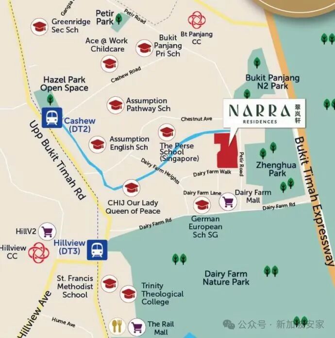 Narra Residences 翠嵐軒 位於新加坡第 23 區,依託 Dairy Farm 的自然資源,以 「森林與城市共生」 為核心概念,完美平衡了自然與 accessibility,步行可達周邊配套設施,交通四通八達。這裡既能在綠意中享受寧靜,又能快速融入城市核心生活圈,實現 「鬧中取靜」 的理想居住狀態。