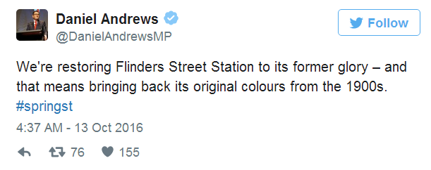维州的交通部长说,将Flinders Street Station重新喷涂为原来的颜色,能够体现墨尔本这座地标性建筑的悠久历史。
