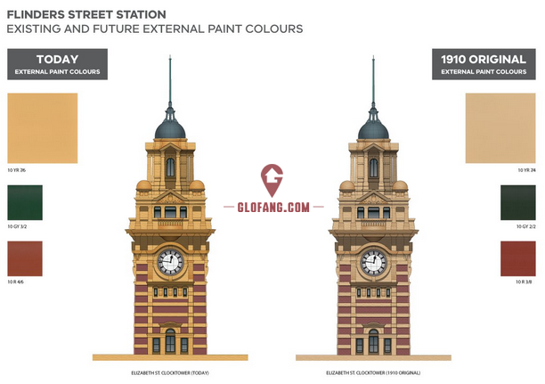 为此,政府还将采购5000升特制的涂料。完工之后,Flinders Street Station的外观颜色将从墨尔本人所熟悉的芥末黄变为原来的淡黄色,而栗色和绿色的部分则会加深。
