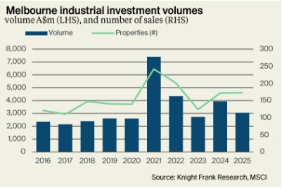 莱坊的分析显示,2025 年墨尔本工业地产行业的交易额总计为 31 亿澳元,比 2024 年下降 23%,这表明随着资本追逐东海岸其他市场的机会,投资活动将持续萎缩。