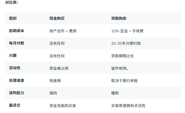 在决定是以现金购房还是通过贷款购房之前,最好比较一下这两种选择在成本、灵活性、风险和长期收益方面的差异。