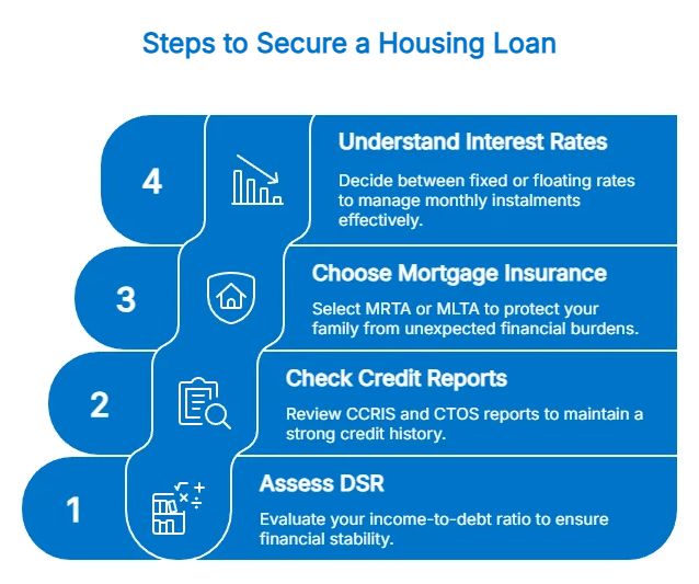 银行会根据申请人的债务偿还比率 (DSR)、CCRIS 和 CTOS 信用报告进行评估。较高的 DSR 或不良的信用记录会导致贷款被拒,从而延缓您的购房计划。因此,在申请贷款之前,建立并保持良好的财务状况至关重要。