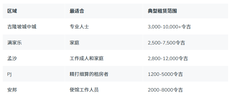 吉隆坡市中心、武吉免登、吉隆坡市中心、蕉赖和孟沙南周边地区的公寓和合租公寓供应量更多,且往往提供更灵活的住宿安排。