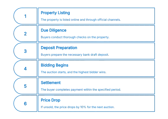 - 通常由银行通过持牌拍卖师进行拍卖。